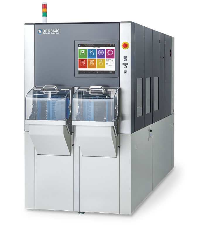 与以往机型DFG8540相比约减少了13%的占地面积。此外,通过清洗机构动作时间的缩短以及搬运手臂动作的调整,与DFG8540相比每小时的搬运片数提高了1.2倍以上。
